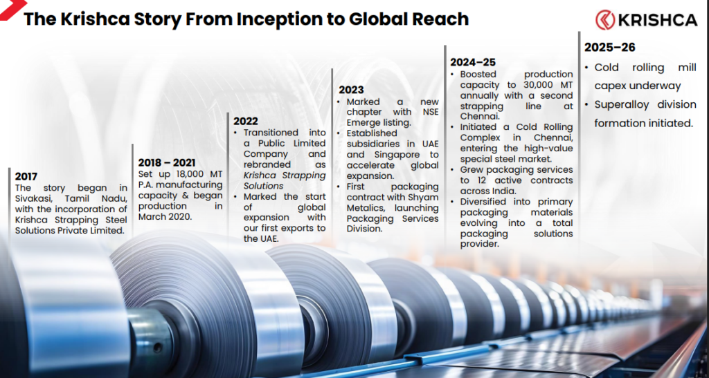 The promoter Bala Manikandan, conducted a top-down analysis of the Indian Steel Industry. He observed that while India’s steel production was projected to grow aggressively from 100 million tons to a projected 300 million tons within 5-7 years (a CAGR of 15%) and the ancillary support ecosystem was lagging. Specially steel strapping used for securing steel coils (the heavy-duty packaging required to hold steel coils). At the time, the market was an oligopoly serviced by only three manufacturers catering to the entire nation. Seeing a clear supply deficit and a growing addressable market, the promoter deployed initial family capital to set up Krishca Strapping Solutions Ltd in 2017, with a strategy focused on technical differentiation, consistency, and long-term customer stickiness rather than price-led competition.