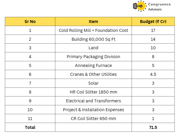 Utilization of the ₹68 crore of which ₹46.50 Cr has been earmarked for manufacturing facility expansion (primarily funding the 60,000 TPA cold rolling mill complex and related backward integration) and ₹12.50 Cr for working capital to support packaging contracts and setting up new product lines for primary packaging (tarpaulins, dunnage bags, VCI films, etc.), and ₹9.04 crore for general corporate purposes.
