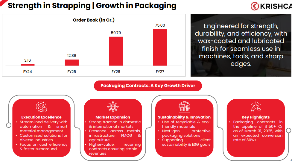 Packing Contracts – Krishca Strapping Solutions Ltd entered the packing contract business as a forward integration to structurally strengthen revenue visibility and protect its core steel strapping volumes as the steel industry increasingly migrates towards outsourced, end-to-end packaging solutions.