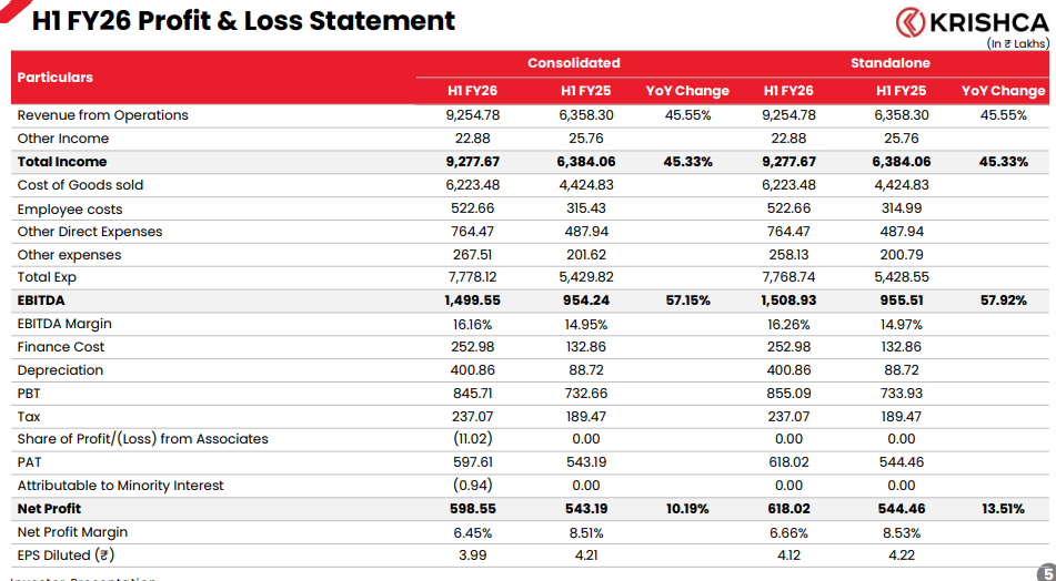 Krishca Strapping Solutions Ltd printed a robust performance in H1FY26 with consolidated total income growing 45.3% YoY to ₹92.78 crore from ₹63.84 crore in H1 FY25. (Standalone results were similar, as there was no material subsidiary contribution yet) Revenue from, while EBITDA surged 57.2% to ₹14.99 crore with margins expanding to 16.2% from 14.95%. Net profit grew 10.2% to ₹5.99 crore, though margins dipped slightly to 6.45% due to higher depreciation and finance costs from ongoing capex.