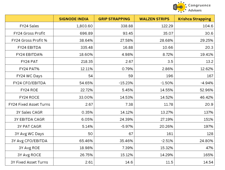 To benchmark Krishca Strapping Solutions Ltd’s performance and positioning, we have compared it with the key unlisted peers in the Indian steel strapping market – Signode India (market leader), Grip Strapping, and Walzen Strips. Since these peers are unlisted, detailed financials are available only up to FY24; hence, the comparison uses FY24 numbers for consistency.