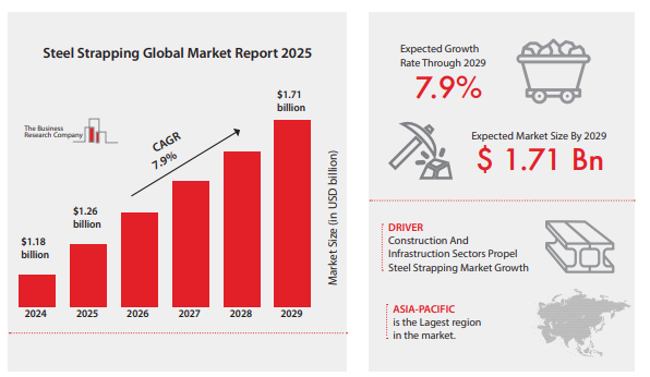 According to The Business Research Company, the market reached $1.26 bn in 2025 (up from $1.18 bn in 2024) and is projected to grow to $1.71 billion by 2029 at a CAGR of 7.9%, with further extension toward $1.82 bn by 2030. Key drivers include robust expansion in construction and infrastructure sectors, rising global logistics volumes, and growth in metal, paper, glass, and building materials industries. Asia-Pacific dominates as the largest region in 2025, fueled by rapid industrialization, massive steel production (led by China and India), infrastructure megaprojects, and expanding manufacturing/export bases.