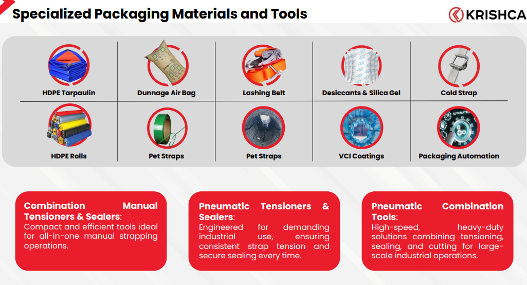 With a state-of-the-art manufacturing facility located in Chennai (Thiruvallur district), Krishca Strapping Solutions Ltd services customers across India and select export markets through a combination of direct strapping supplies and long-term packing contracts, where Krishca Strapping Solutions Ltd provides end to end packaging solutions including strapping material, tools, manpower and maintenance. To deepen wallet share and evolve from a product supplier to a solutions provider, Krishca Strapping Solutions Ltd has expanded its primary packaging portfolio to include tarpaulins, dunnage air bags, HDPE/LDPE films, desiccants and VCI-based corrosion protection products, which are increasingly critical in export packaging and moisture-sensitive steel logistics.