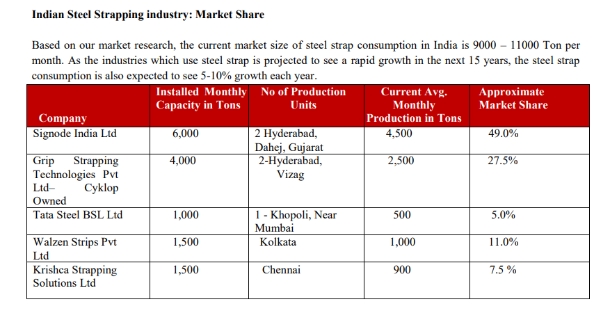 - Signode India Ltd (part of global leader Signode/Crown Holdings): ~49% market share, with ~6,000 tonnes/month installed capacity across units in Hyderabad and Dahej (Gujarat), producing ~4,500 tonnes/month on average. It remains the clear market leader with a strong legacy presence.