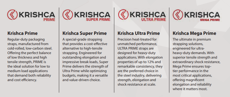 Krishca Strapping Solutions Ltd manufactures high-tensile steel strapping used for securing heavy loads in steel coils, TMT bundles, glass and construction materials, where product consistency and tensile performance are mission-critical.