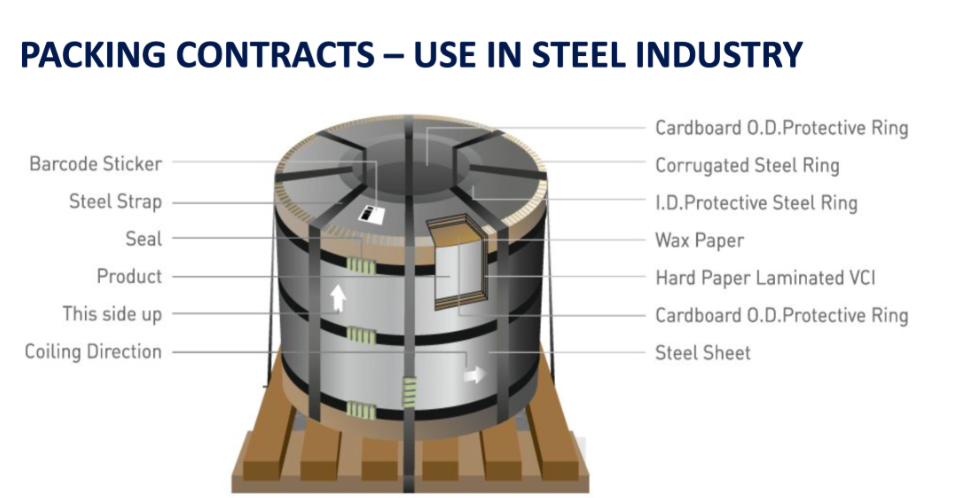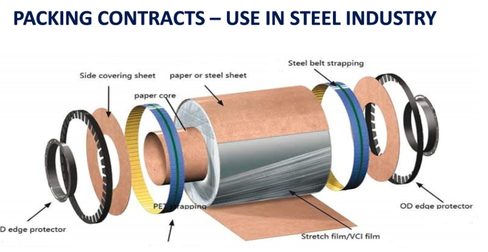 Within steel mill packaging, steel strapping is only one component of the overall packaging requirement. A wide range of primary packaging materials such as HDPE and LDPE films, VCI (volatile corrosion inhibitor) packaging, desiccants, tarpaulins, lashing materials, and other protective plastics are required to prevent corrosion and physical damage during storage and transportation.
