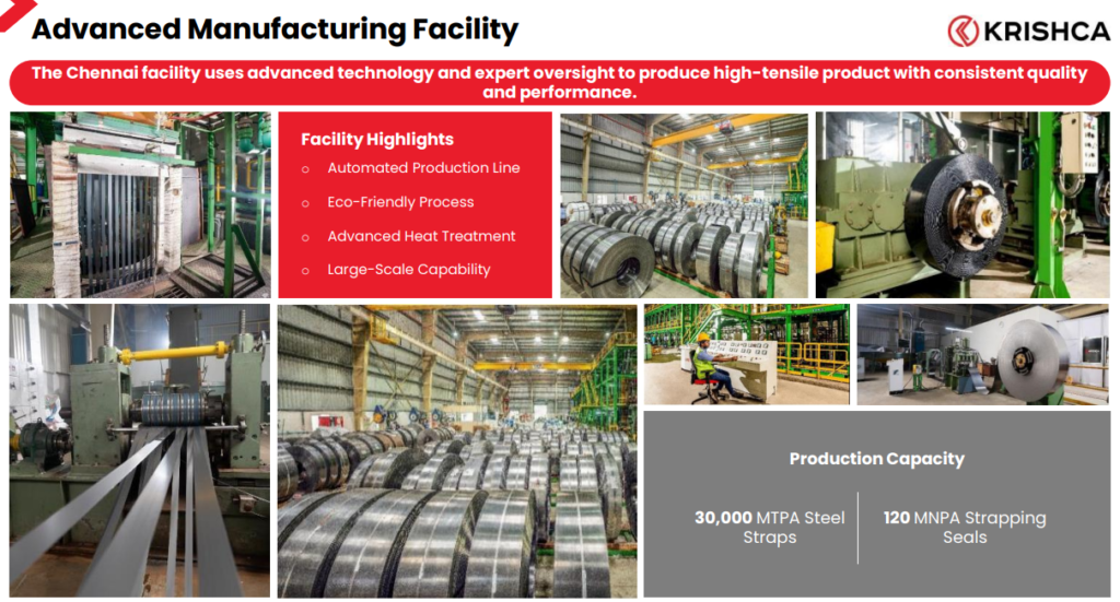 Krishca Strapping Solutions Ltd operates a state-of-the-art integrated manufacturing facility in Chennai with an installed steel strapping capacity of ~30,000 MT per annum (increased from the initial ~18,000 MT through phased expansions and new hardening/tempering lines), along with in-house production of strapping seals and supply of strapping tools. This enables the company to offer customers a complete securing system rather than a standalone consumable product.
