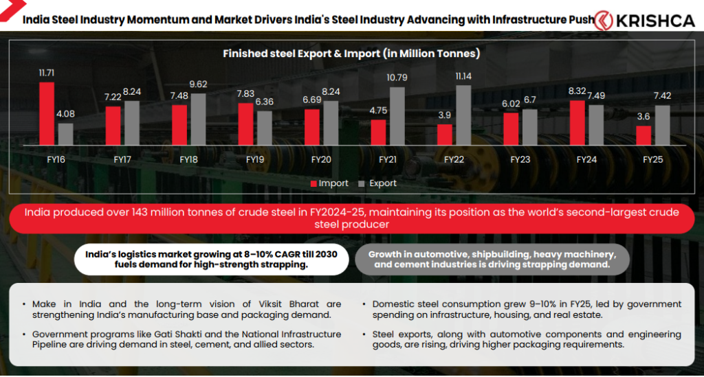 Proxy on India’s Steel Capex Supercycle – India is the world’s 2nd largest steel producer (~151 MT crude in FY25) and is targeting 300 MT capacity by 2030 under the National Steel Policy. This implies a sustained 7-10% CAGR in steel production and consumption for the next 5-10 years, driven by infrastructure (Gati Shakti, NIP), housing, automotive, exports, and manufacturing localization. Steel strapping and packaging are non-discretionary consumables tied directly to finished steel output and movement. Krishca Strapping Solutions Ltd sits in the sweet spot of this chain. Every additional tonne of steel produced/consumed requires reliable strapping and packaging. With domestic consumption already at ~150 MT and growing 9-11% YoY, ancillary demand (strapping + contracts) is structurally expanding at similar or higher rates, which provides Krishca Strapping Solutions Ltd with a medium term, high-visibility growth runway without needing to chase new end-markets.