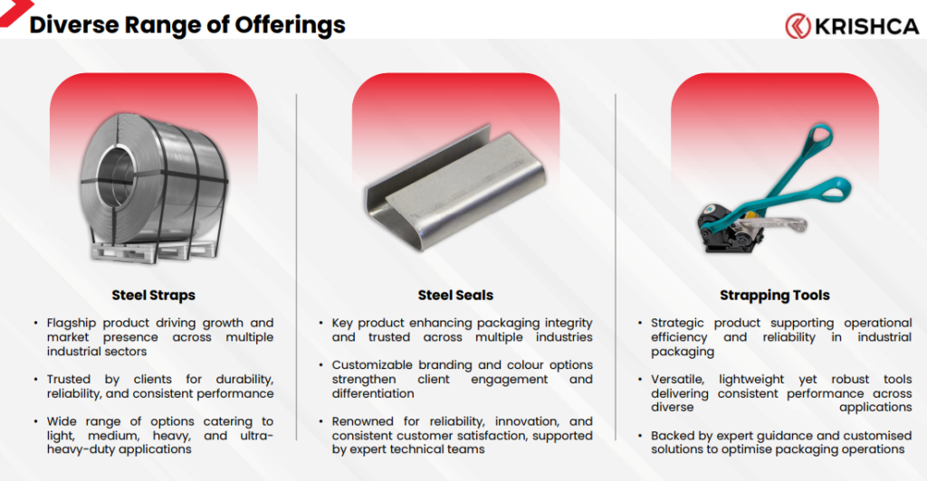 Since customers consuming steel strapping also require these allied products, primary packaging is a natural extension of Krishca Strapping Solutions Ltd’s product basket. Krishca Strapping Solutions Ltd has already begun offering several of these products, including through its export-facing operations, and leverages the same sales and technical teams to provide solution-led engagement with customers.