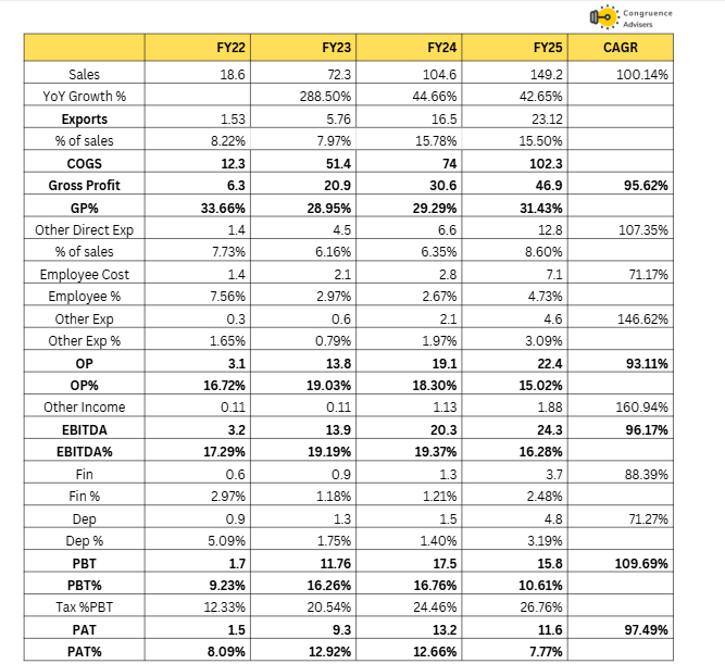 Krishca Strapping Solutions Ltd has scaled well from FY21 to ₹150 Cr in FY25, This growth has been driven by rapid volume ramp-up in steel strapping, onboarding of large customers, and gradual scaling of packing contracts and exports.. Exports contributed steadily, growing at 33.3% CAGR to ₹23.12 Cr in FY25 (15.5% of sales), though management noted in H1 FY26 investor call that aggressive Chinese/Korean competition subdued volumes, leading to prioritization of domestic markets. Gross profit expanded at 95.6% CAGR to ₹46.9 crore in FY25, with gross margins holding stable at 29-33%, supported by operating leverage, R&D led raw material optimizations (5-6% cost savings from alternate steel grades, as highlighted in FY24 concall).