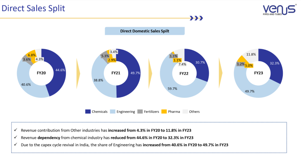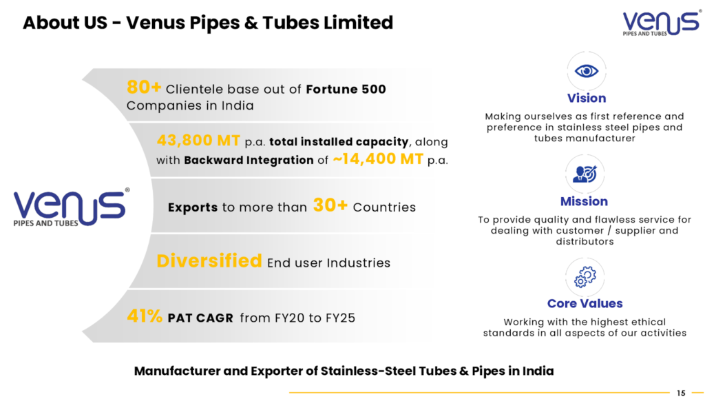 Venus Pipes & Tubes Ltd is witnessing significant demand across several key sectors, with a particular emphasis on the Power sector. Management noted “encouraging momentum” in this sector, providing clear visibility for sustained growth. Venus Pipes and Tubes Ltd recently secured a large order worth ₹190 Cr for stainless steel seamless boiler tubes from a leading integrated power plant equipment manufacturer for supercritical and subcritical thermal power projects.