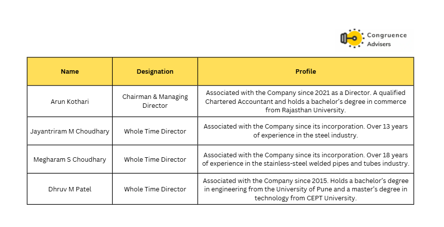 - Board Composition – The Board of Directors of Venus Pipes & Tubes Ltd. comprises 8 members, of whom 4 are Independent Directors. 3 whole-time directors and Mr Arun Kothari act as Chairman & Managing Director.