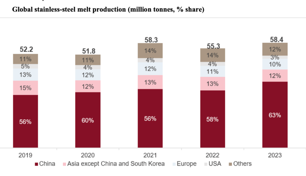 Global stainless-steel melt production increased to 58.4 million tonnes in 2023 from 52.2 million tonnes in 2019, logging a CAGR of approximately 3%.