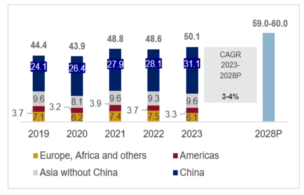 The global demand for stainless steel is expected to grow at a CAGR of 3-4% over the next five years to 59-60 million tonnes in 2028. This growth in global stainless-steel demand will be supported by growth in consumption from key end-use sectors such as consumer goods, energy and chemicals, building and construction, and automobiles.