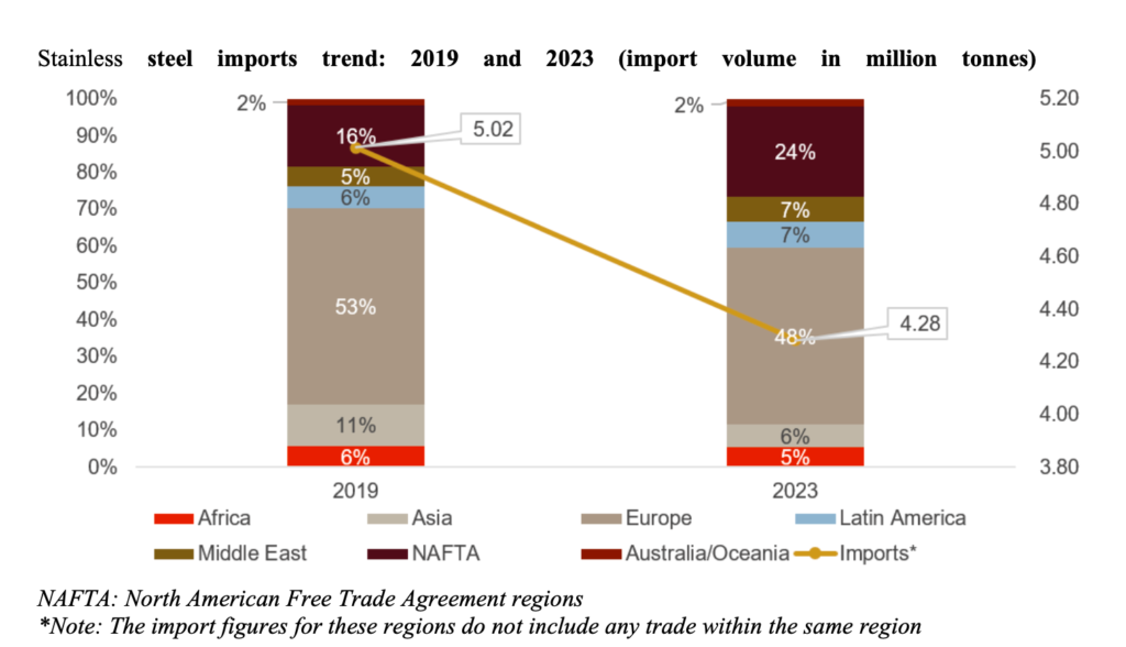 Share of Asia in global stainless-steel imports declined from 53% in 2019 to 48% in 2023, primarily due to higher domestic production capacity supported by a higher focus on self-sufficiency in these countries.