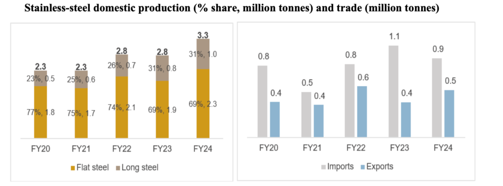 Domestic stainless-steel production grew from 2.3 million tonnes in FY20 to 3.3 million tonnes in FY24, clocking a CAGR of about 10%.
