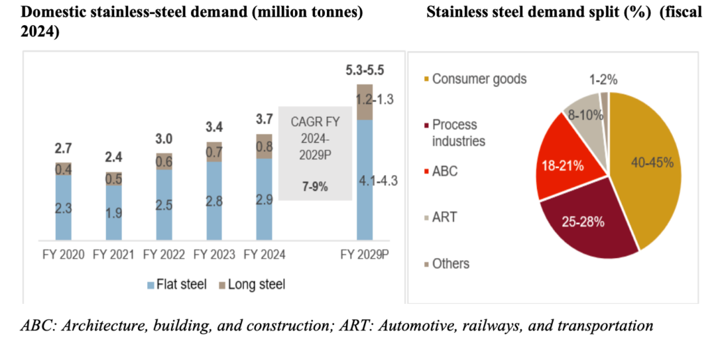 Domestic stainless-steel demand is expected to grow at a CAGR of 7-9% during fiscal 2024-2029 to 5.3-5.5 million tonnes per annum in FY29. The major end-use industries that are expected to support this healthy domestic demand growth include consumer goods, process industries, infrastructure, building, construction, and automobile.