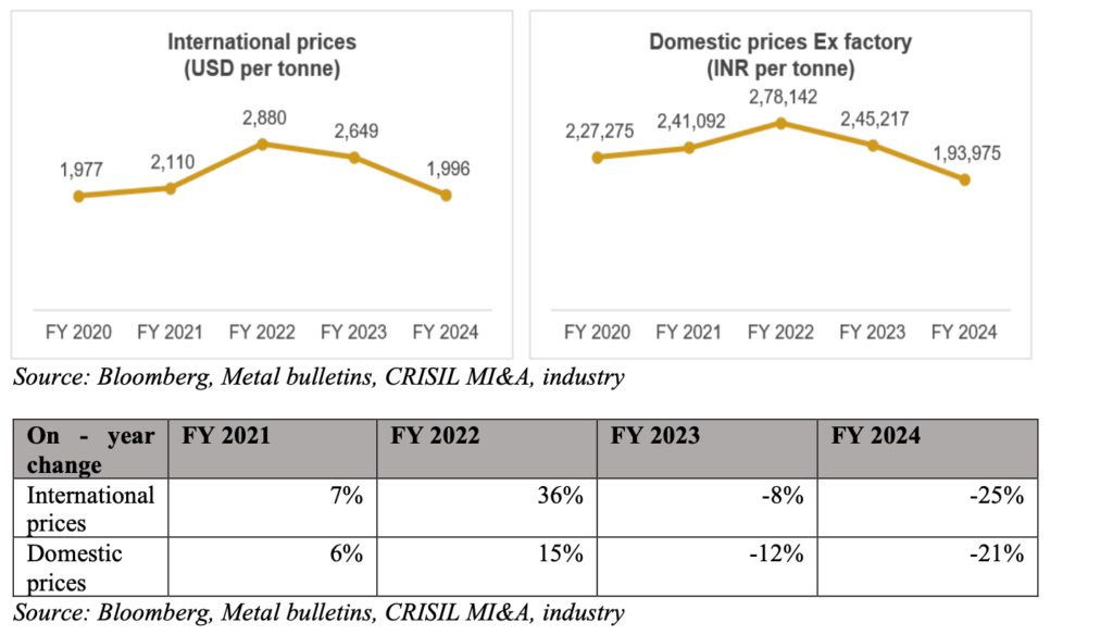 Both international and domestic prices followed a similar growth trend over the last five fiscal. The prices increased in FY21 and FY22 owing to pandemic-led supply-side issues, leading to a demand-supply imbalance. In FY22, the Indian steel industry recovered from the supply-side issues and started production at near-optimum utilization levels, thereby cutting down the dependence on steel imports. Though the domestic stainless-steel prices increased on-year in FY22 but their magnitude remained lower than the on-year price increase in the international prices in the fiscal year as a result. The prices, however, cooled down in the next two fiscals due to the resolution of supply side issues, fall in demand in key countries of Europe and the Americas, and fall in prices of key raw materials used in steel production.