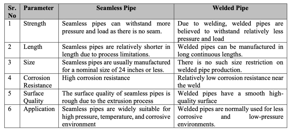 Seamless pipes are pipes without a seam(end joints) and are manufactured using billets, whereas welded pipes are manufactured by welding the flat steel strips into a round / circular shape. Some of the key differences between welded and seamless pipes are listed in the table below-