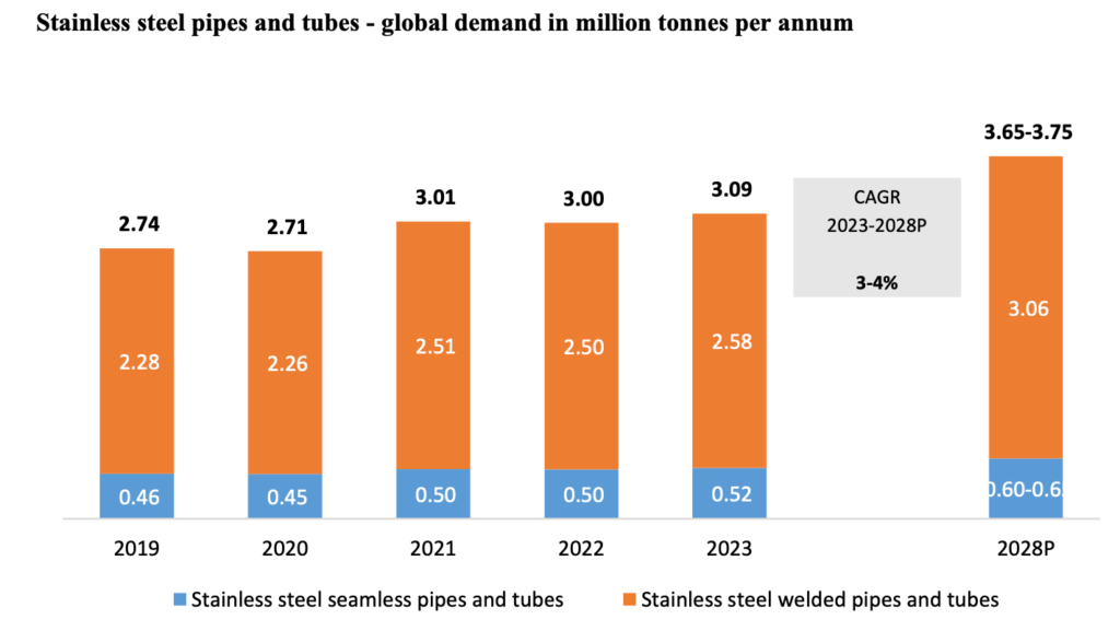 Between 2023 and 2028, the demand for stainless steel pipes and tubes is expected to increase at a CAGR of 3-4% to approximately 3.65-3.75 million tonnes in 2028.