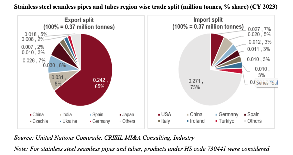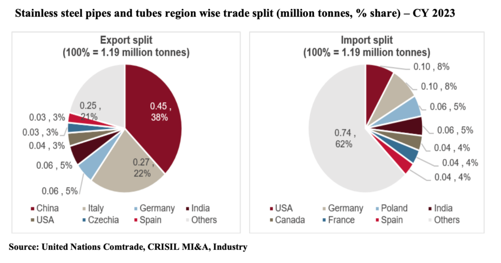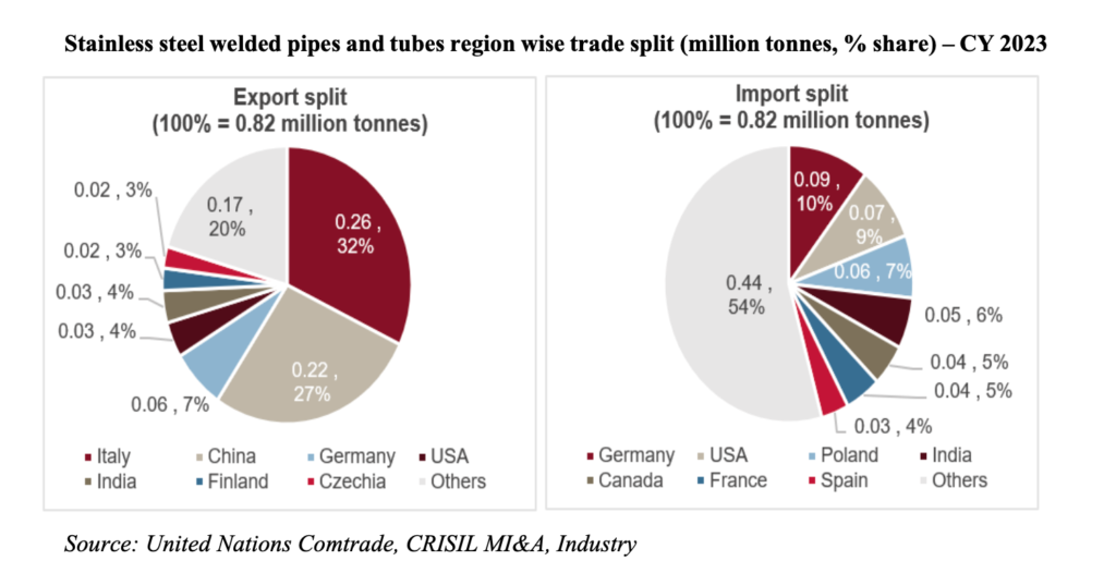 As far as exports are concerned, Italy, Canada, and Saudi Arabia cumulatively accounted for around one-third of India’s total exported volume of stainless-steel pipes and tubes in FY24.