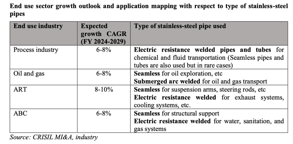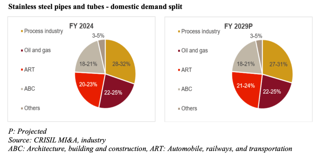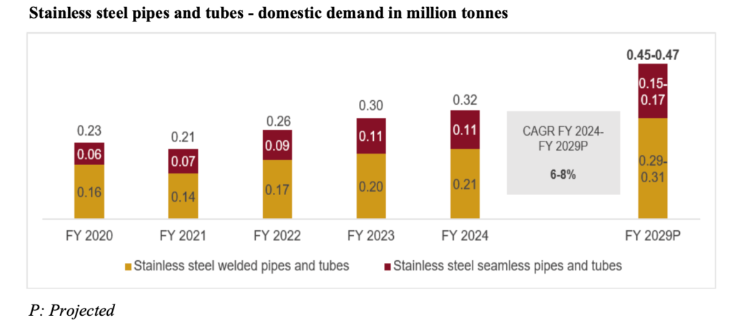 Between fiscals 2024 and 2029, the domestic demand for stainless steel pipes and tubes is expected to increase at a CAGR of 6-8% to 0.45-0.47 million tonnes in FY29.