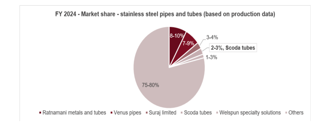 The stainless steel pipes and tubes manufacturing industry is largely fragmented, with key leading players such as Venus pipes, Ratnamani metals and tubes, Suraj limited, Scoda tubes, and Welspun specialty solutions accounting for around 20-22% of the domestic market.