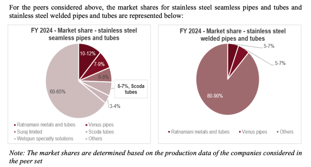For the peers considered above, the market shares for stainless steel seamless pipes and tubes and stainless steel welded pipes and tubes are represented below: