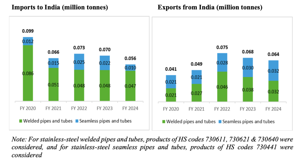 However, the exports of stainless-steel pipes and tubes further declined at a CAGR of (-8%) between fiscals 2022 and 2024 to 0.064 million tonnes in FY24, primarily because of the inflationary environment of key export markets and geopolitical conflicts in FY23 and FY24.