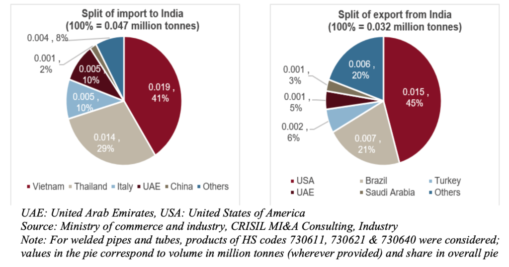 In FY24, India imported the majority of stainless-steel welded pipes and tubes from Vietnam (share in total imports was ~41%), followed by Thailand (~30%) and Italy (~10%). The high import volume from Vietnam was on the account of its low cost and India’s free trade agreement with the country.