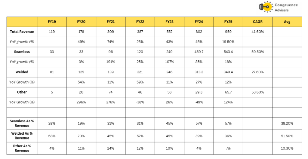 Seamless pipes are currently the largest contributor to revenue, accounting for 57% of total revenue in FY25. Seamless segment revenue contribution, which improved from 28% in FY19 to 57% in FY25. This segment commands higher margins compared to welded pipes. Management has noted that EBITDA margins for seamless pipes are typically 40% to 50% higher than welded pipes. Seamless pipes Revenue has grown higher when compared to other segments from FY19-FY25, growing at a 59.5% CAGR, driven by anti-dumping duty by the government of India on imports and rapid expansion by the company.