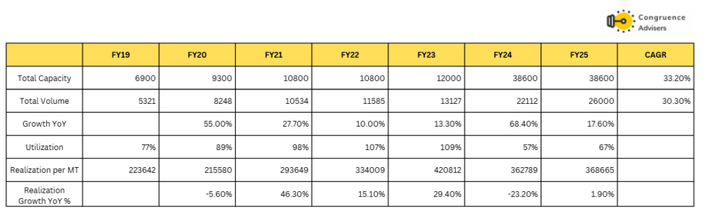Venus Pipes and Tubes Ltd increased its stainless-steel pipes & tubes capacity three times over FY23-25, which helped the company increase its market share to 8-10% in FY25. Venus Pipes and Tubes Ltd outpaced every player in the industry, reporting 33% volume growth over FY19-24. For FY25, Revenue at Rs 959 Cr is up 19.49% Cr, and Volume growth is 17%.