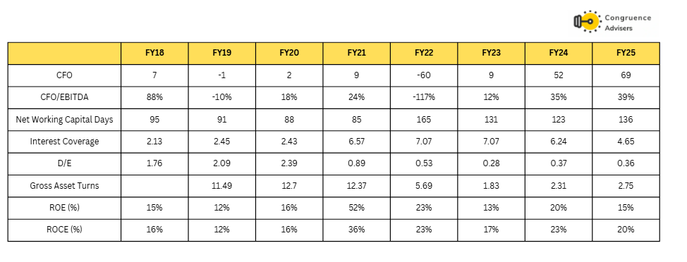 Venus Pipes & Tubes Ltd has seen a sharp improvement in operating cash flows, with the CFO turning consistently positive post FY22 and reaching 69 Cr in FY25, but conversion remains modest at 39% of EBITDA, reflecting structurally high working capital locked in 130–165 days through the last four years. Interest coverage has stayed healthy but is trending down from about 7x in FY22–23 to 4.65x in FY25 as absolute debt has risen, keeping D/E in a moderate 0.3–0.4x range versus above 2x in FY18–20. Asset turns have normalized from a very high 11–13x pre‑IPO to sub‑3x now as Venus Pipes and Tubes Ltd has front‑loaded capacity, while returns have also come off their peak, with ROE/ROCE moderating from over 50% and 35% earlier to about 18–20% and 20–30% respectively.