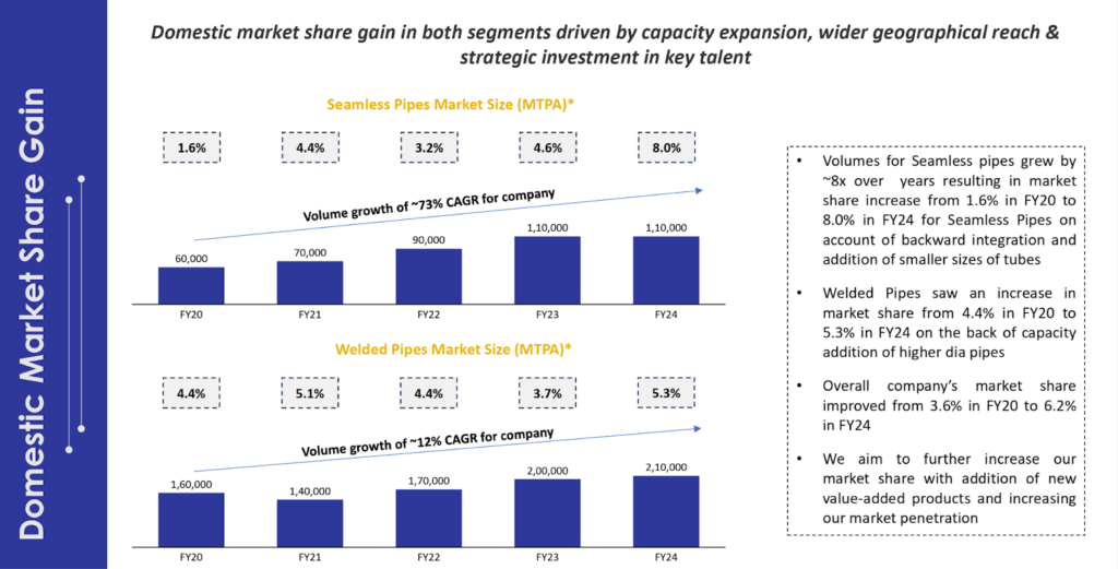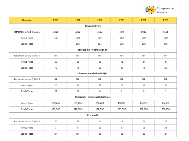 - Seamless vs. Welded: Seamless pipes command significantly higher margins than welded pipes (a difference of roughly 40% to 50%). The revenue contribution from the seamless segment increased significantly over the years (e.g., from ~32% in Q3FY22 to ~57% in FY25).