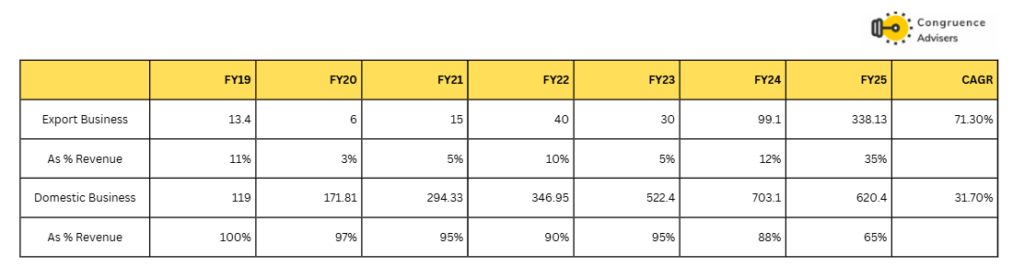 - Export revenue grew from a mere ₹6 crores in FY20 to ₹338 crores in FY25.