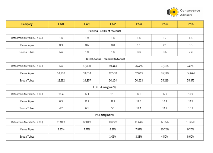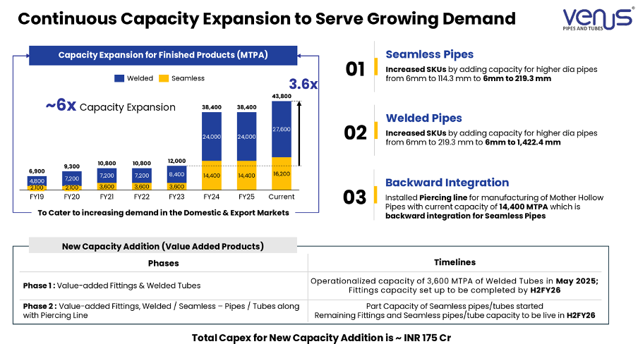 - Full Utilization: By FY25, Venus Pipes and Tubes Ltd achieved full backward integration for a substantial portion of its seamless capacity, further boosting FY25 gross margins to 33.3%.