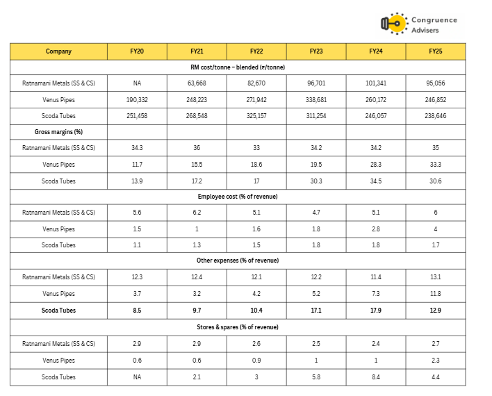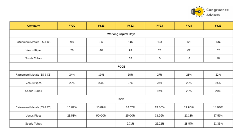 Venus Pipes & Tubes Ltd lagged its larger peers in FY25 with gross margins of 33.3%, improving from 28.3% in FY24 but still below Ratnamani Metals’ 35% and marginally above Scoda Tubes’ performance. At the EBITDA level, Venus Pipes achieved 17.5% margins, showing solid improvement from 18.2% in FY24, now closer to Venus Pipes & Tubes Ltd 15.9%. However, the critical weakness emerges in PAT margins, where Venus Pipes & Tubes Ltd delivered 9.70%, substantially trailing Ratnamani’s 10.45% and Scoda’s 6.60%, revealing continued challenges in debt servicing and working capital management. The revenue scale shows Venus Pipes & Tubes Ltd at ₹989 Cr (FY25) exceeding Scoda Tubes’ ₹485 Cr but significantly behind Ratnamani Metals’ ₹5,186 Cr, which includes carbon steel segment revenue, while the revenue mix remained consistent with 57% seamless SS and 36% welded SS for Venus, reflecting Venus Pipes & Tubes Ltd’s specialized product positioning.