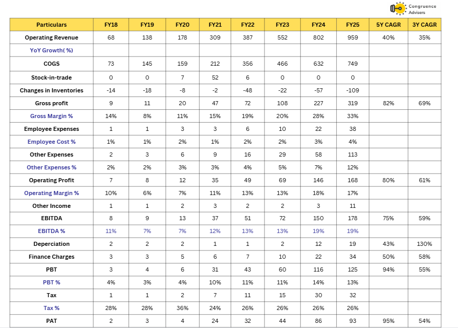 Over the last 5 years, Venus Pipes and Tubes Ltd has grown revenues at a CAGR of 40%, EBITDA at a CAGR of 75%, and PAT at a CAGR of 95%, with revenue growth above double-digit in the last 5 years. During this period, EBITDA margins have improved around 11-19% from FY18-FY25, and PAT has been volatile between 3–11%, respectively. Over the 3 years, Venus Pipes and Tubes Ltd revenues have grown at a CAGR of 35%, EBITDA at a CAGR of 61%, and PAT at a CAGR of 54%.