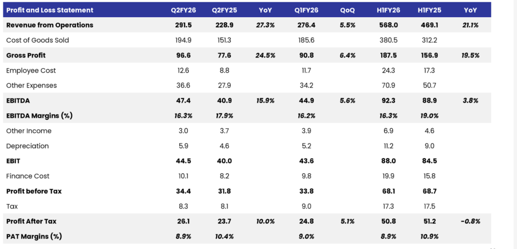 Venus Pipes & Tubes Ltd revenue grew 27% YoY, and Seamless up +25% YoY and Welded: +48% YoY, supported by a blended volume growth of 20%+ YoY in Q2FY26. The share of seamless/welded in Q2FY26 was 56%/39%.