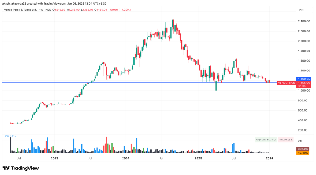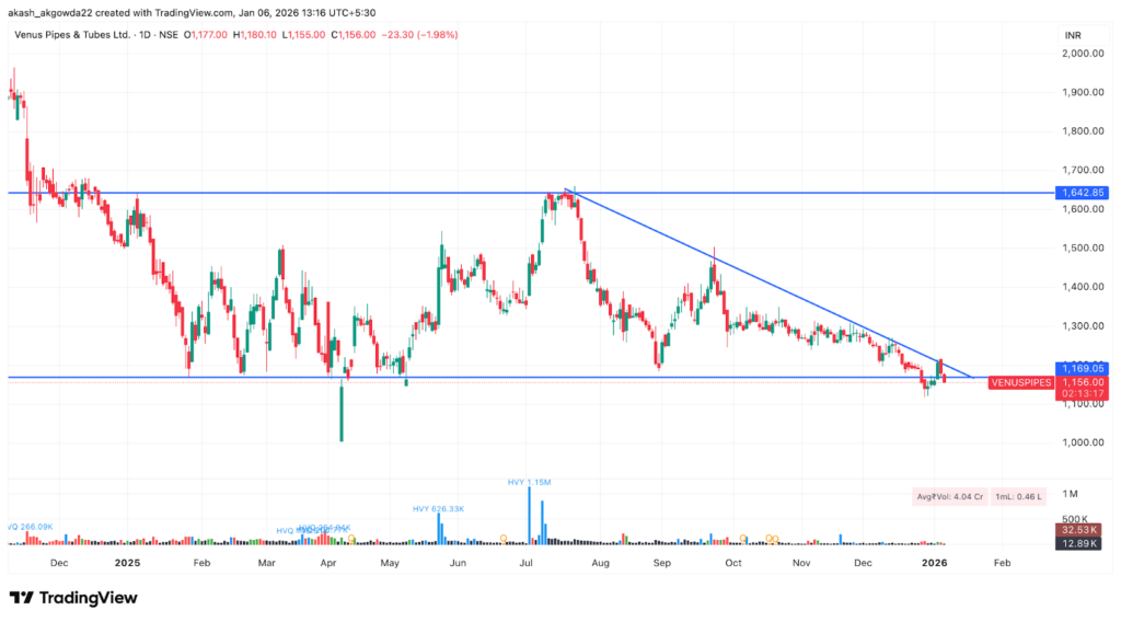 On a Weekly Chart Venues Pipes & Tubes Ltd, the long-term structure shows a strong multi-year uptrend that peaked near the 2,400 zone, followed by a prolonged corrective phase with lower highs and lower lows. Price has retraced back to a major horizontal demand area around 1,150-1,170, which earlier acted as a breakout base during the prior rally. The repeated tests of this zone suggest it is a critical make-or-break level. Sustained closes below it would confirm a deeper trend reversal, while stabilization here could still allow for a base-building phase. However, muted volumes and the absence of strong bullish candles indicate weak buying conviction so far, keeping the broader market cautious to bearish until a clear weekly reversal signal emerges. And we can see a bearish chart pattern of a head and shoulder.