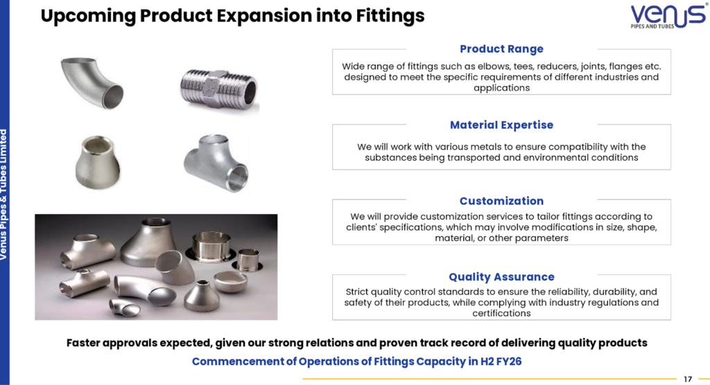 Strategic Shift to Value-Added Products – Venus Pipes & Tubes Ltd is moving up the value chain to reduce commoditization risks and improve profitability. The portfolio now includes higher diameter welded pipes (LSAW up to 56 inches) and specialized Titanium grade tubes for critical applications. The company is entering the Fittings business (expected completion H2 FY26) to offer complete PFF (Piping, Fittings & Flanges) solutions. This is a high-margin segment with low competition, where Venus plans to use its own manufacturing scrap as raw material to optimize costs