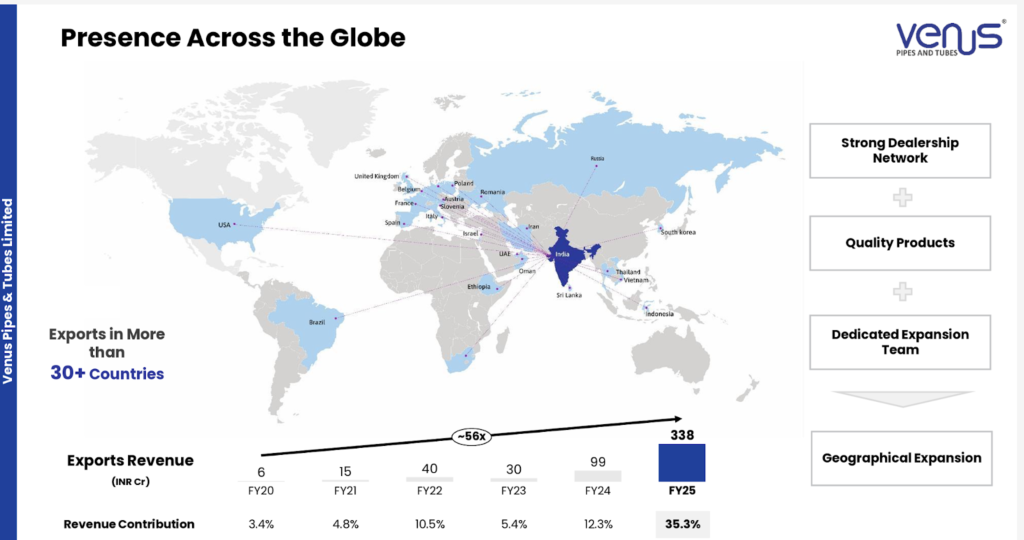 Export Market – Export revenue has grown from just ₹6 Cr in FY20 to ₹338 Cr in FY25. Exports now contribute approximately 35-40% of total revenue. Venus Pipes & Tubes Ltd exports to over 30 countries, with a strong foothold in the European Union and increasing traction in the USA and the Middle East. The US share of exports was 20% in Q2FY26. Tariffs are getting passed on fully to customers. China has higher tariffs than India which is benefiting Indian companies.