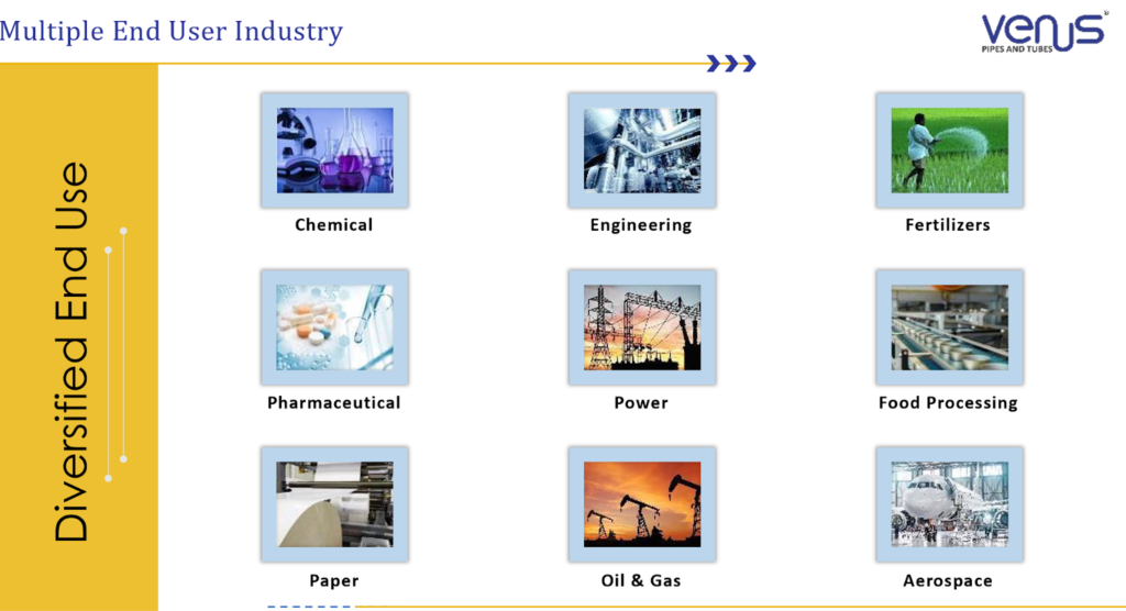 Venus Pipes and Tubes Ltd has a diversified B2B end‑user base across process, energy, engineering and high-spec industries.