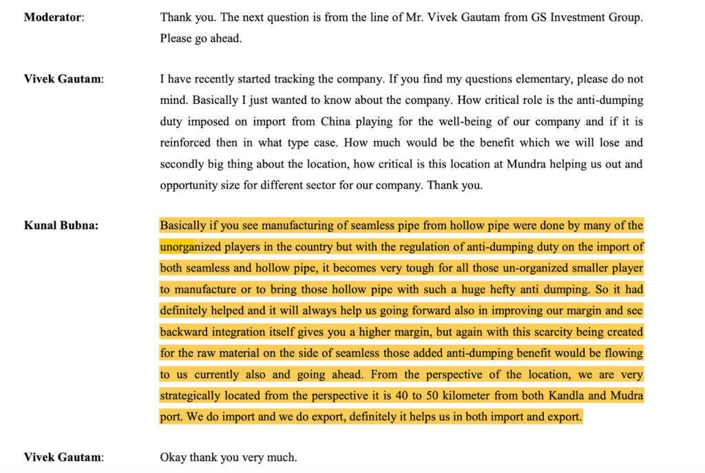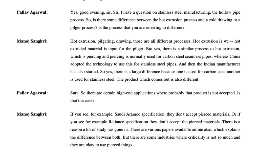 Necessity of Backward Integration: With ADD imposed on imported hollow pipes, manufacturers must integrate backward (set up piercing lines or hot extrusion) to remain competitive. Management notes that backward integration is a “costly affair” requiring significant capex, which unorganized or small players cannot afford. Consequently, no major capacity announcements have been seen from unorganized players in the seamless segment till FY24.