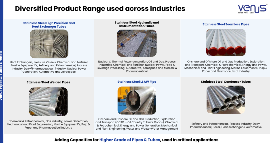 - Higher Diameter & Precision: In the welded segment, Venus Pipes and Tubes Ltd began manufacturing higher diameter pipes (up to 48 and 56 inches) and LSAW pipes, where there is lower competition and better pricing power compared to routine sizes.