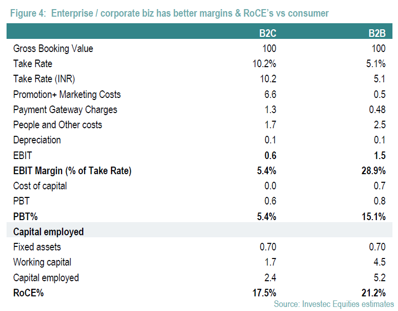 Below is a rough comparison of the economics of a B2C transaction versus a B2B transaction. While gross take rates in B2C are much higher than B2B, by the time customer inducement costs and payment gateway charges are accounted for, B2B transactions tend to have a much higher EBIT margin. B2B transactions require higher capital deployed because corporates have to be given credit terms for payments versus instant payments received in the B2C segment. In spite of the larger capital requirements, on an ROCE basis, B2B transactions tend to make more than B2C transactions.