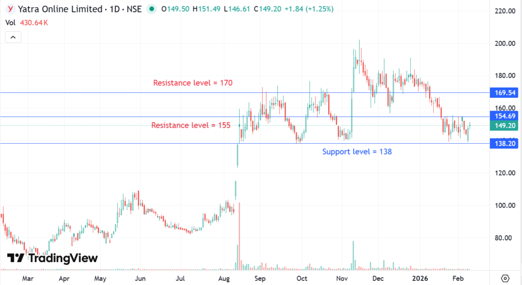Unless results surprise on the downside or there is further market level volatility from current levels, we expect the 138 support level to hold. Q3 FY26 will be the first full quarter with the Globe Travels acquisition in the base (Q2 had 20 days only), so the YoY growth in operating profit in Q3FY26 will be a strong indicator of organic growth at Yatra Online Ltd. If that’s a healthy print (20-25% growth), then Yatra Online Ltd stock should move up gradually as valuations catch up. Better than expected growth, announcement of new acquisition deals or significant reduction in debtors via corporate credit card deals, can make Yatra Online Ltd stock move fast on the upside.