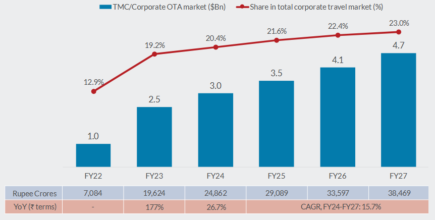 Managed corporate travel is increasing in penetration as more and more corporates outsource their travel ops to Travel Management Companies and Corporate OTAs. As of FY24, it is estimated that the Corporate OTA penetration is at ~20%, accounting for ~USD 3bn of corporate travel spend. This penetration is expected to only increase in coming years as more and more corporates turn to online and SaaS based travel management services. The corporate managed travel industry is expected to grow at 15-16% over the next few years.