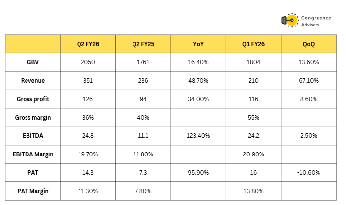 Yatra Online Ltd reported very strong Q2 FY26 numbers with GBV growing 16% YoY, revenue growing 49% YoY and gross profit growing 34% YoY. EBITDA grew 123% and PAT grew 96% demonstrating huge operating leverage.