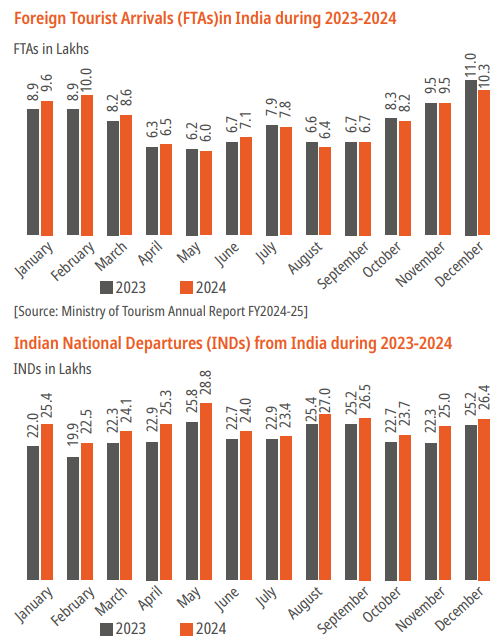 According to provisional estimates from the Ministry of Tourism, India recorded 9.66 million foreign tourist arrivals in 2024, contributing over ₹2.77 lakh crore in foreign exchange earnings with a strong 19.8% growth over the previous year.